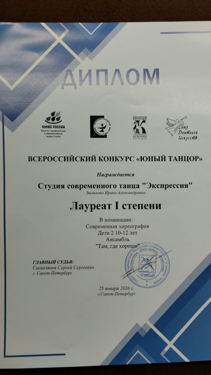25 января 2026 года в городе Санкт-Петербург состоялся Всероссийский конкурс «Юный танцор», организованный Санкт-Петербургской Федерацией современных и эстрадных танцев. В этом ярком событии блеск и талант продемонстрировали юные танцоры из детского объединения хореографического коллектива «Экспрессия» МБОУ «Рощинский ЦО». В номинации «Современная хореография» группа нашего коллектива представила зажигательный номер «Там, где хорошо», который удостоился высоких оценок жюри. Наши девочки с гордостью получили диплом «Лауреат первой степени». Общее восхищение и аплодисменты в зале, были невозможны без мастерства и вдохновения хореографа Ирины Александровны Зыльковой, чья преданность искусству и своим ученикам заслуживает особой благодарности.